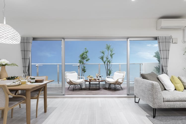 真ん中の窓を開け放てば、居室からバルコニーへ、さらには空へとつながる格別の開放感を満喫できます。